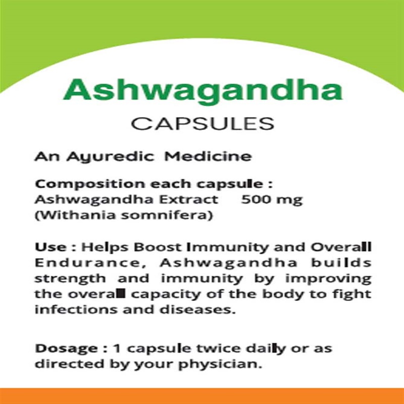 Ashwagandha capsules are helpful in relieving stress and anxiety It is anti-inflammatory and antioxidant in nature, therefore improves physiological endurance It helps in enhancing memory and uplifts mood These capsules are beneficial in the rejuvenation of the body. Dosage:1 Capsule Twice Daily.